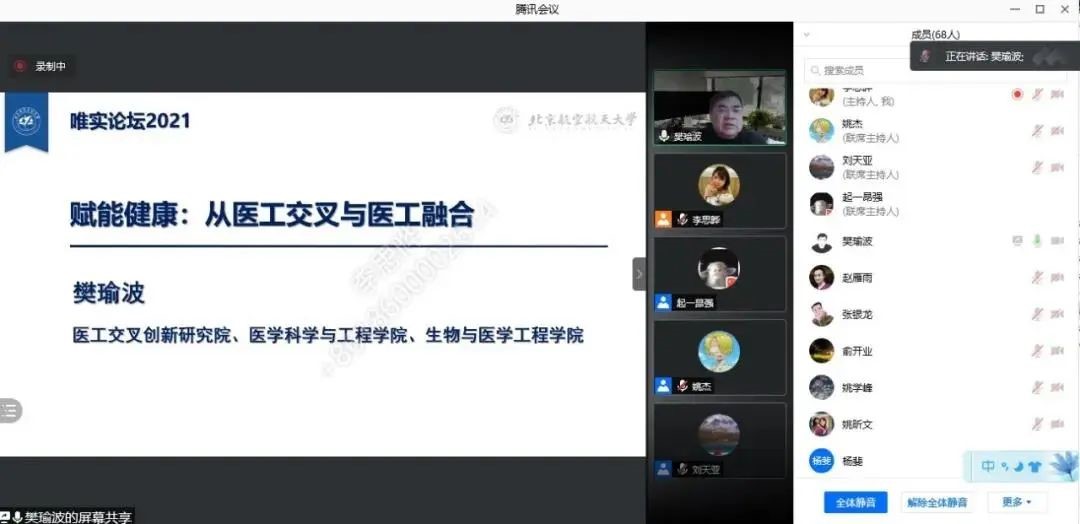 2021年4月3日,北航第九届唯实-医工交叉国际青年科学家线上论坛成功举办。本次分论坛由医工交叉创新研究院(北京市生物医学工程高精尖创新中心、大数据精准医疗高精尖创新中心)、生物与医学工程学院、医学科学与工程学院联合召集,邀请了来自哈佛大学、斯坦福大学、加州理工大学、帝国理工学院、南洋理工大学等世界一流大学和科研机构的近百人青年学者参加了会议。北京市生物医学工程高精尖创新中心主任、医工交叉创新研究院院长、医学科学与工程学院院长樊瑜波教授,生物与医学工程学院、医学科学与工程学院书记韩慧瑜老师,大数据精准医疗高精尖创新中心主任田捷教授,生物与医学工程学院院长齐颖新教授,以及学院学术委员会的教授和老师们参与了这次别开生面的线上论坛。