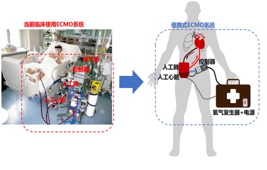 图6 正在研发的便携式人工肺示(右图)与目前临床人工心肺(左图)对比示意图