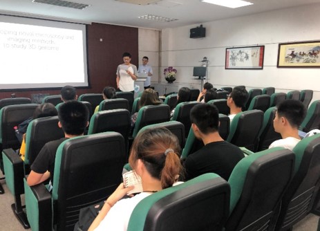 此次报告主题为“新型显微技术开发与3D基因组成像技术”。会上,高教授介绍了课题组开发的多种高分辨率成像技术,包括SDOM, GS-DOM, 以及分子探针技术,例如HD-FISH, Cas-FISH, MB-FISH。结合这些新型的检测成像技术,科研人员可以更加精确地观测细胞的染色体结构以及动态情况,更好的解读基因转录和调控机理。