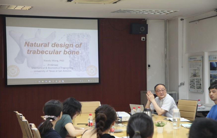 本次学术报告的主题为《Nature’s design of trabecular bones》, 王教授主要讲授了关于松质骨仿真结构设计相关的内容。在一个小时的讲座中,教授先对松质骨做了简单的介绍,包括松质骨的结构功能性能等方面,之后讲解了如何通过仿真设计,制造出能够与真实松质骨相似的结构,其中考虑到了松质骨的结构性能等多个方面。