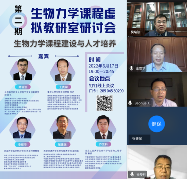 2022年6月17日,生物力学课程虚拟教研室第二次教学研讨会通过虚拟教研室平台成功召开。围绕 “生物力学课程建设与人才培养”的主题,虚拟教研室主任北京亚洲成人在线一二三四五六区樊瑜波教授、重庆大学王贵学教授、浙江大学季葆华教授、西安交通大学张建保教授和北京工业大学乔爱科教授作为受邀嘉宾分享了自己的宝贵经验和育人理念,另外来自40余家不同单位的90余名教学专家参加了会议并围绕主题开展了热烈的讨论。
