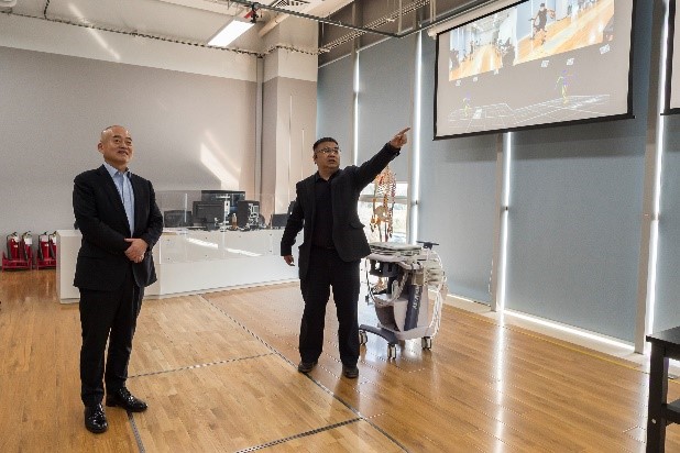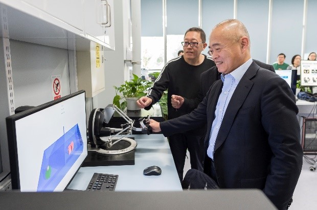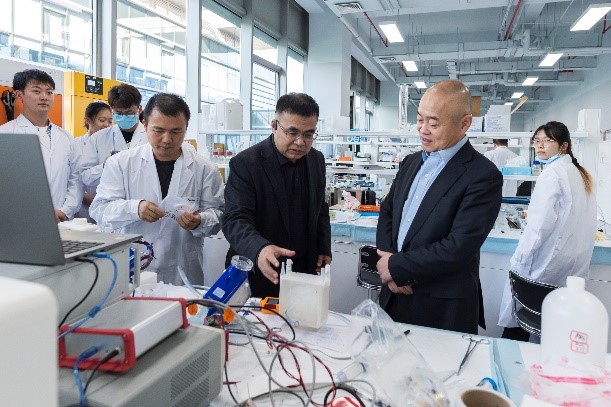 樊瑜波院长带领参观并展示了中心在组织替代修复与再生植介入医疗器械、智能诊疗技术、智能治疗与康复等方向的创新成果,张强董事长重点参观了体外反搏康复系统、多模态上肢康复机器人系统、ECMO系统、生物柔性传感技术等实验平台。张强董事长对中心在人才培养、平台建设、创新成果以及应用转化等方面给予了高度评价。
