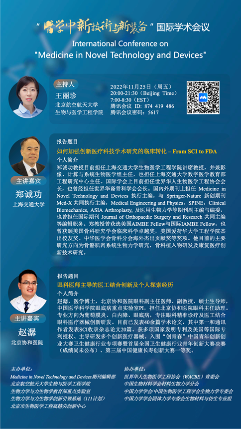 本次会议由Medicine in Novel Technology and Devices期刊编辑部、北京亚洲成人在线一二三四五六区生物与医学工程学院、生物力学与力生物学教育部重点实验室、生物力学与力生物学创新引智基地(111计划)、北京市生物医学工程高精尖创新中心主办,由世界华人生物医学工程协会(WACBE)青委会、中国生物材料学会材料生物力学分会、中国力学学会/中国生物医学工程学会生物力学专委会、中国力学学会固体力学专委会生物材料与仿生专业组协办,医学中新技术与新装备国际学术会议将于2022年11月-12月以线上方式举办。