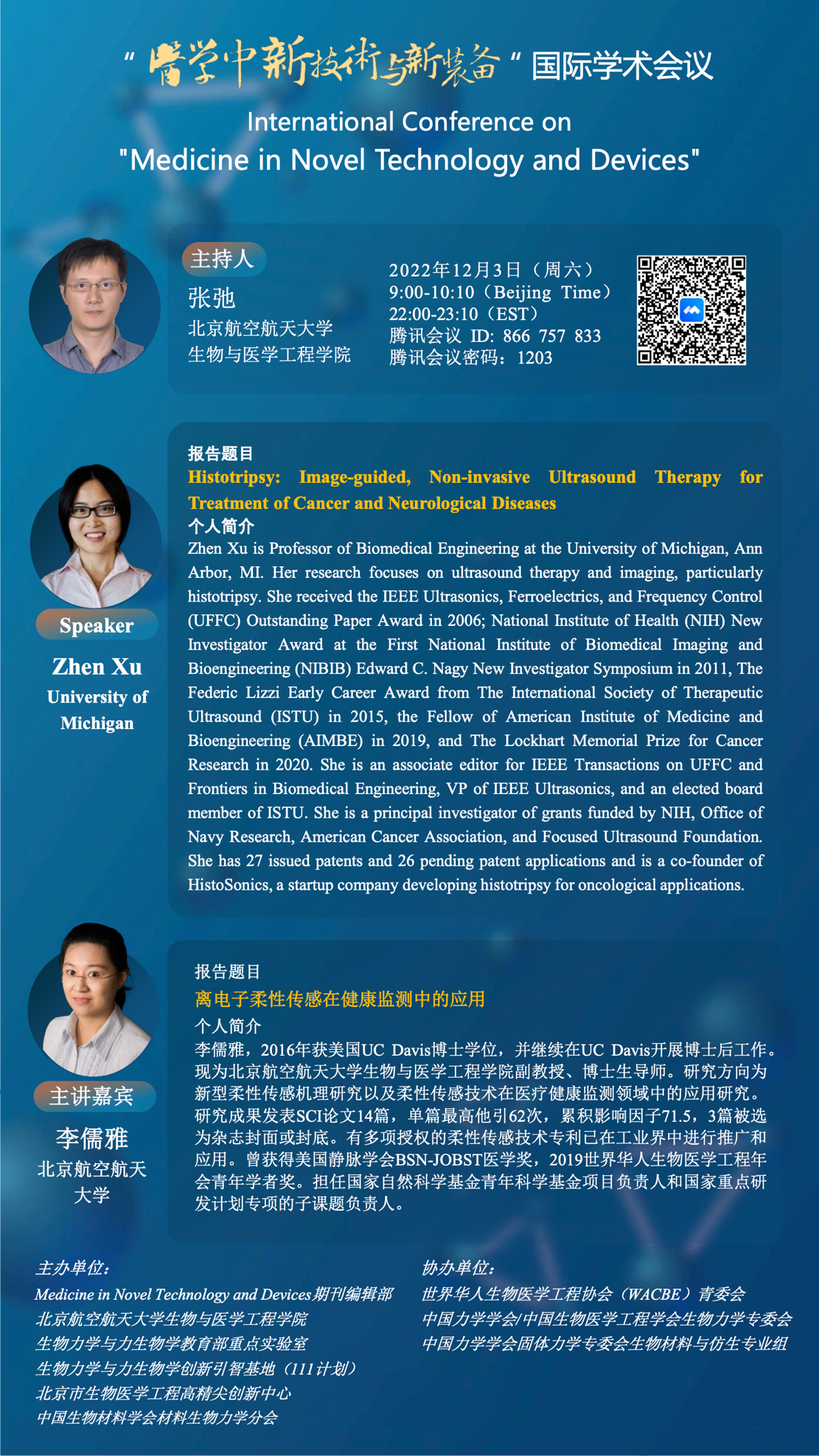 专家简介:Zhen Xu is Professor of Biomedical Engineering at the University of Michigan, Ann Arbor, MI. Her research focuses on ultrasound therapy and imaging, particularly histotripsy. She received the IEEE Ultrasonics, Ferroelectrics, and Frequency Control (UFFC) Outstanding Paper Award in 2006; National Institute of Health (NIH) New Investigator Award at the First National Institute of Biomedical Imaging and Bioengineering (NIBIB) Edward C. Nagy New Investigator Symposium in 2011, The Federic Lizzi Early Career Award from The International Society of Therapeutic Ultrasound (ISTU) in 2015, the Fellow of American Institute of Medicine and Bioengineering (AIMBE) in 2019, and The Lockhart Memorial Prize for Cancer Research in 2020. She is an associate editor for IEEE Transactions on UFFC and Frontiers in Biomedical Engineering, VP of IEEE Ultrasonics, and an elected board member of ISTU. She is a principal investigator of grants funded by NIH, Office of Navy Research, American Cancer Association, and Focused Ultrasound Foundation. She has 27 issued patents and 26 pending patent applications and is a co-founder of HistoSonics, a startup company developing histotripsy for oncological applications.