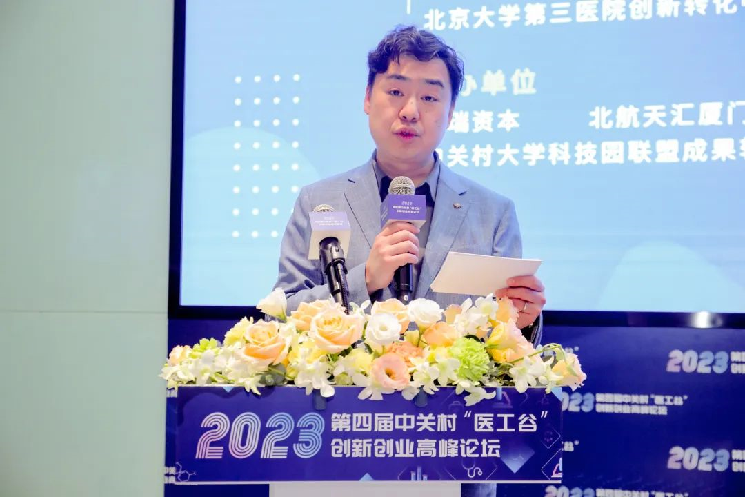 作为主办方代表,中关村大学科技园联盟理事长、北航天汇孵化器董事长李军现场致辞,北京大学第三医院副院长宋纯理通过线上连线的方式为大会致辞。
