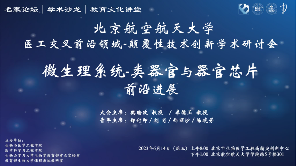 2023年6月14日,在北京亚洲成人在线一二三四五六区成功举办了医工交叉前沿领域—颠覆性技术创新学术研讨会:微生理系统-类器官与器官芯片前沿进展。本研讨会由生物与医学工程学院、医学科学与工程学院、生物力学与力学生物学教育部重点实验室、教育部生物力学课程虚拟教研室、高端医疗装备与器械国家医学攻关产教融合平台联合主办,樊瑜波教授和李德玉教授担任研讨会大会主席,郑付印、刘肖、郑丽沙、陈晓芳四位青年老师担任青年主席。