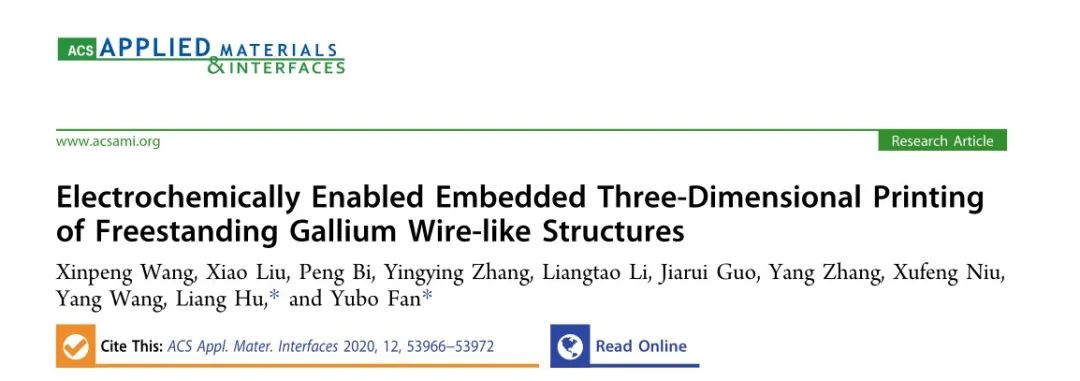 在本研究中,为了制造具有大尺寸和高分辨率的平面且独立的镓结构,提出了一种电化学诱导的嵌入式3D打印(3e-3DP)方法。并开发了一种简捷的固化方法,以有效地从支撑凝胶中转移镓结构。简言之,该方法通过喷嘴将液态镓挤出到支撑水凝胶中(下图)。利用电化学方法在液态镓表面诱导形成表面氧化层,将液态镓打印为具有相同直径而不是小液滴的连续导线。同时,借助支撑体系,可以制成各种2D和3D结构。在固化和去除支撑基质之后,固化的镓结构可以独立放置。这些镓结构具有高导电性和良好的延展性,可以无缝组装成弹性体,从而制造出柔性导体和压力传感器,进而更加灵活方便地适应各种应用。