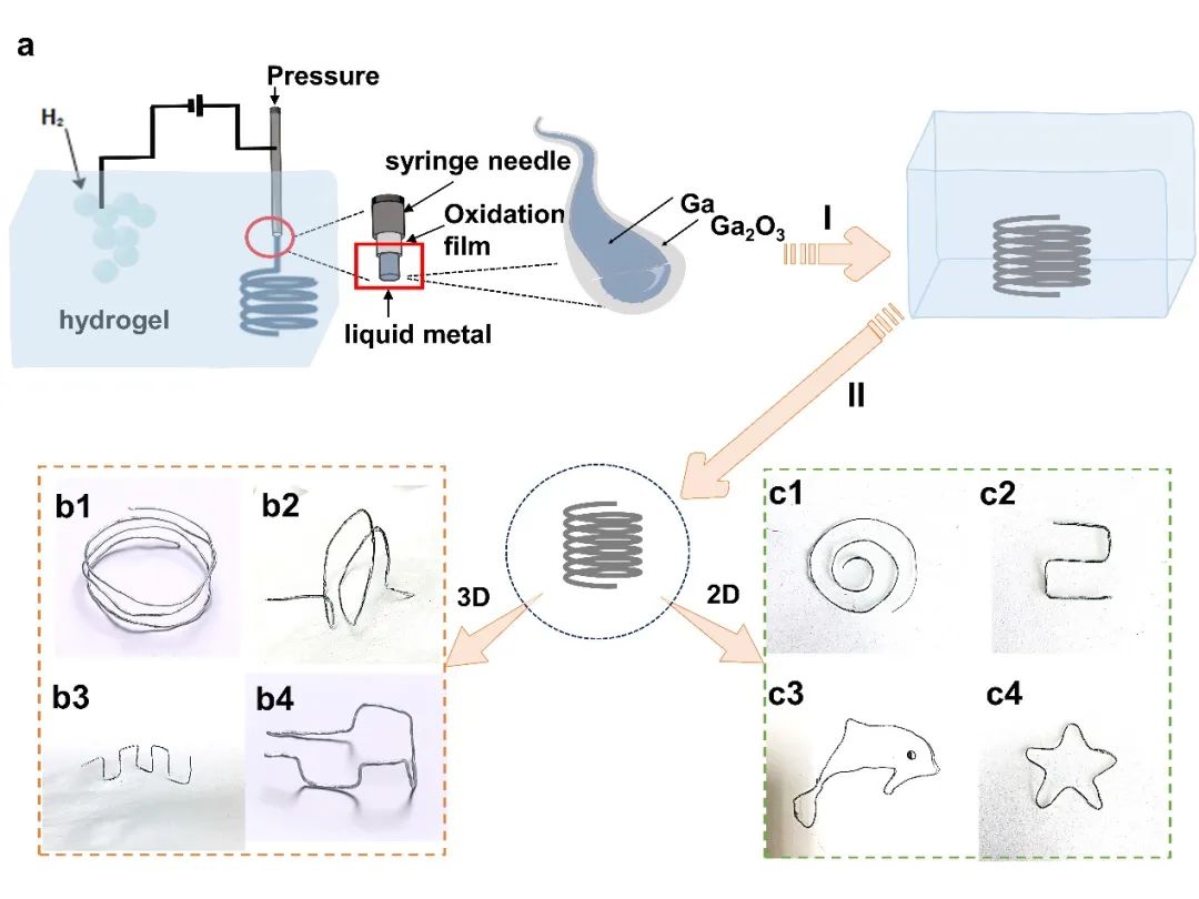 镓金属(熔点为29.8°C)除了具有高导电性和良好的延展性的特性以外,其可变形机械性能可以使设备在刚性静态和柔性可重构状态之间实现可逆转换,从而可以适用于更多应用系统。而且,许多电子设备(例如电感器、电容和天线)以3D形式能够更有效地工作,因此,在周围环境中能够打印3D独立式镓结构具有很大价值,尤其是在诸如可穿戴电子设备和生物医学设备等应用中。但是,由于镓的表面张力大,它们通常在从喷嘴中挤出后形成液滴。虽然在空气中液态金属表面形成的氧化层可以在某种程度上帮助支撑良好的形状甚至独立的结构。然而,这种薄氧化层的承载能力远远不足以用于稍大的结构,例如大约几厘米高。这大大影响了打印分辨率和应用范围。而且,由于镓的过冷度大,因此需要较低的温度和更长的时间才能完全凝固,这也给制造独立的镓结构带来了挑战。