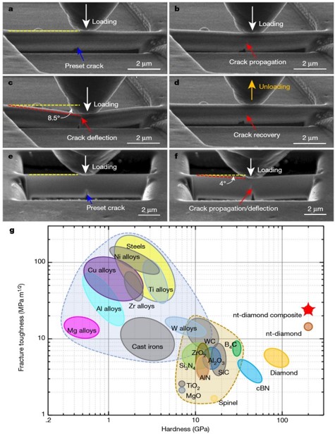 图3 纳米孪晶复合金刚石及纯孪晶相金刚石材料的原位弯曲变形过程及与其他工程材料硬度和断裂韧性的比较。