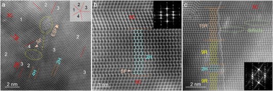 图2 15 GPa, 2000 °C条件下合成的纳米孪晶复合金刚石中非3C多型结构的HAADF-STEM像