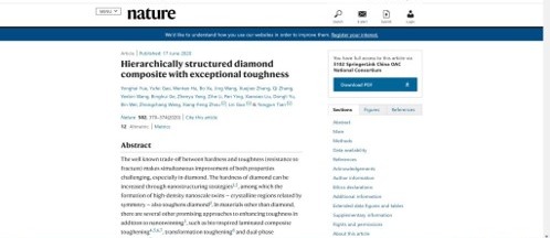 2020年6月18日,Nature杂志在线全文发表了我校化学学院郭林教授、岳永海教授团队与燕山大学田永君院士团队在纳米孪晶复合金刚石增韧机制方面的最新研究成果:“Hierarchically structured diamond composite with exceptional toughness”。国家优秀青年基金获得者岳永海教授,高宇飞博士、胡文涛教授、徐波教授为文章共同第一作者,周向锋教授、郭林教授、田永君院士为共同通讯作者。