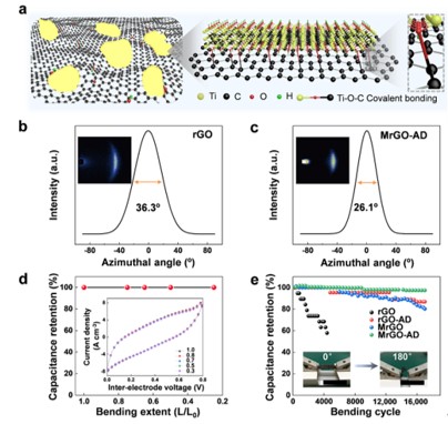 图2 Maxine与氧化石墨烯形成Ti-O-C共价键的示意图(a),石墨烯薄膜材料的广角激光散射图:(b)rGO和(c)MrGO-AD,表明石墨烯纳米片的规整取向度提高。以MXene功能化石墨烯复合薄膜材料为电极组装的柔性超级电容器显示出优异的机械稳定性:(d)不同弯曲率的容量保持率,(e)在0º到180º下进行17000次弯曲循环的容量保持率。