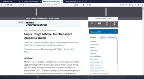 Communications杂志以在线全文Article的形式发表了我校化学学院程群峰教授课题组在超韧材料的最新研究成果“Super-tough MXene-functionalized graphene sheets”。周天柱博士、吴超教授、王艳磊副研究员为第一作者,程群峰教授为通讯作者,北京亚洲成人在线一二三四五六区为第一完成单位。