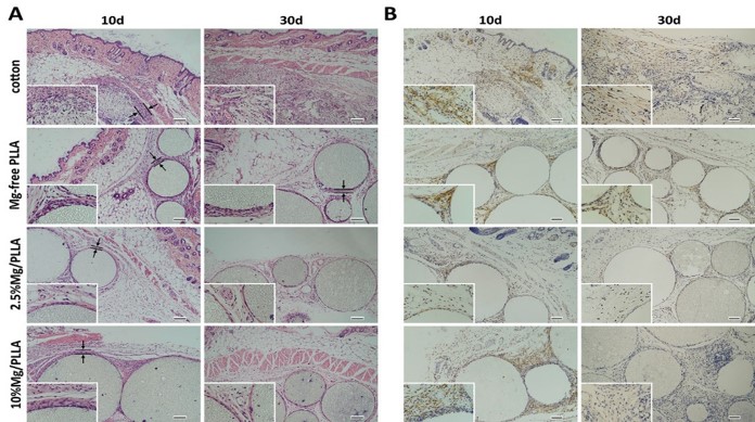 图4. 不同镁含量微球植入10和30天后的细胞浸润分析:(A) H&E染色;(B) F4/80染色。