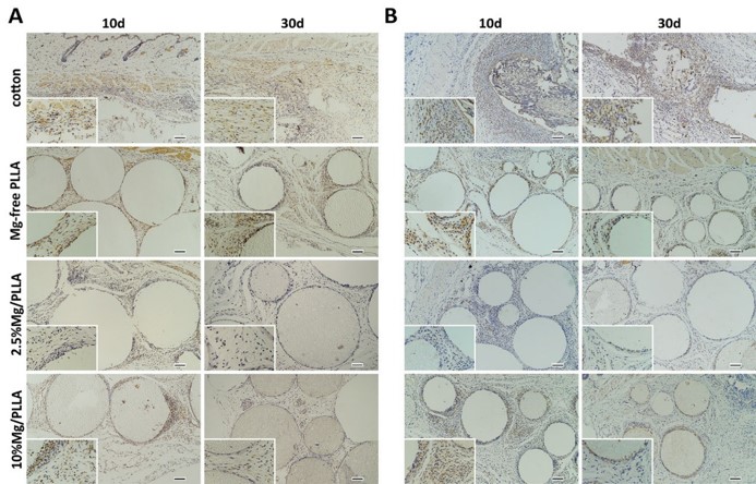 图5. 不同镁含量微球植入10和30天后的免疫组化分析:(A) IL-1β染色;(B) TNF-α染色。