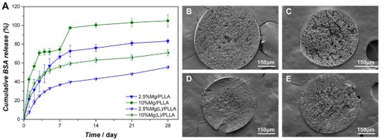 图2. (A)含不同大小镁颗粒微球在PBS中的BSA释放曲线;(B-E)在PBS中浸泡28天后微球内部扫描电镜图像:(B) 2.5%Mg/PLLA微球,(C) 10%Mg/PLLA微球,(D) 2.5%Mg(L)/PLLA微球,(E) 10%Mg(L)/PLLA微球(其中Mg/PLLA表示微球中的镁颗粒直径为9.68 ± 4.93 μm,Mg(L)/PLLA表示微球中的镁颗粒直径为31.02 ± 14.17 μm)。