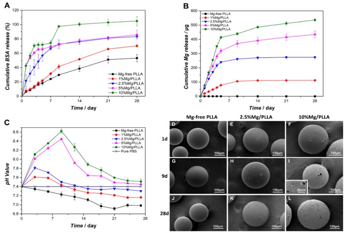 图1. 不同镁含量微球在PBS中的(A)BSA释放曲线,(B)镁释放曲线,(C)溶液pH变化曲线及(D-L)浸泡1,9和28天后的扫描电镜图像。