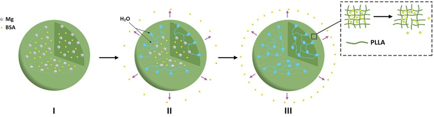 图3. Mg/PLLA微球释放BSA的机制示意图。