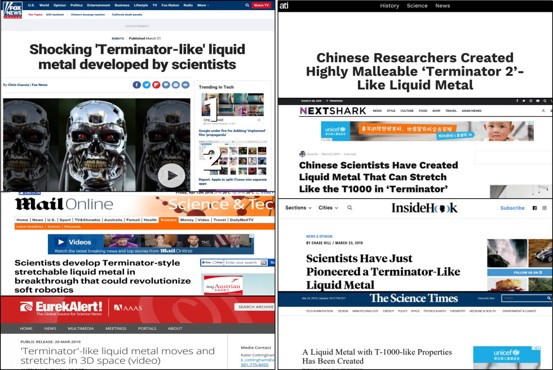 该研究成果发表后,引起了学术界及公众的广泛关注。超过六十家国际重要科技及大众媒体以“中国科学家发明类终结者的液态金属”“科学家首创类终结者的液态金属,将对软体机器人产生重大突破和变革”“震撼的类终结者液态金属问世”等主题对该项工作进行了深入报道和评论,包括美国科学促进会(AAAS)主办的全球科技新闻服务网站EurekAlert,Fox News, Dailymail等。