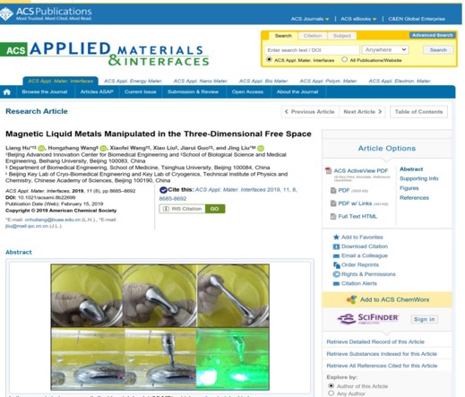 该研究成果发表于美国化学学会旗下的材料科学权威期刊ACS Applied Materials & Interfaces上,论文标题为Magnetic liquid metal droplets manipulated in the three-dimensionalfree space(ACSAppl. Mater. Interfaces 2019, 11, 8,8685-8692)。第一作者为北航医工交叉研究院生物医学工程高精尖中心的胡靓研究员,第一通讯单位为北航生物医学高精尖创新中心。美国化学学会官网以多媒体主题新闻的形式对该项工作进行了详细介绍。