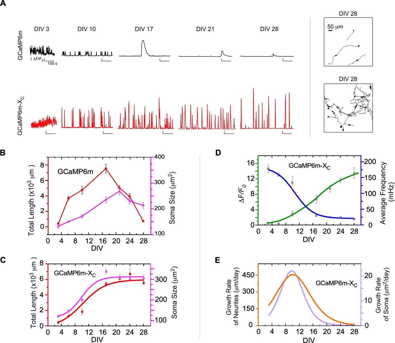在皮层神经元中,自发性钙振荡(主要来源为L型钙通道的钙离子内流)调控神经元突起的生长,称为通道钙动态-神经元发育耦联(Communications Biology 2022, DOI: 10.1038/s42003-022-03438-1)。GCaMP与L型钙通道意外结合进而干扰上述耦联,长期(高)表达GCaMP最终造成了神经元明显的损伤。本工作聚焦于自发钙振荡与神经元形态之间的关联,遵循本实验室此前GCaMP-X探针的“理性设计”原则,利用“分子内保护片段”克服了传统GCaMP的弊端,实现了长时程GCaMP-X在体/离体成像。首先,利用病毒导入和药物诱导转基因表达,GCaMP-X长期表达(³4周)于皮层神经元,揭示出局部自发钙活动会随新生神经元发育成熟的过程逐步发展成为全局同步钙振荡;长期表达GCaMP-X的神经元与对照组健康神经元无统计学差异,据此对发育全程的振荡幅值、频率及突起生长速率等关键指标进行了定量分析,为相关研究领域提供了基础性的信息。与以上离体数据一致,活体成像获得的自发钙波及触须钙响应数据也支持GCaMP-X在神经元相容性等方面优于传统钙探针。