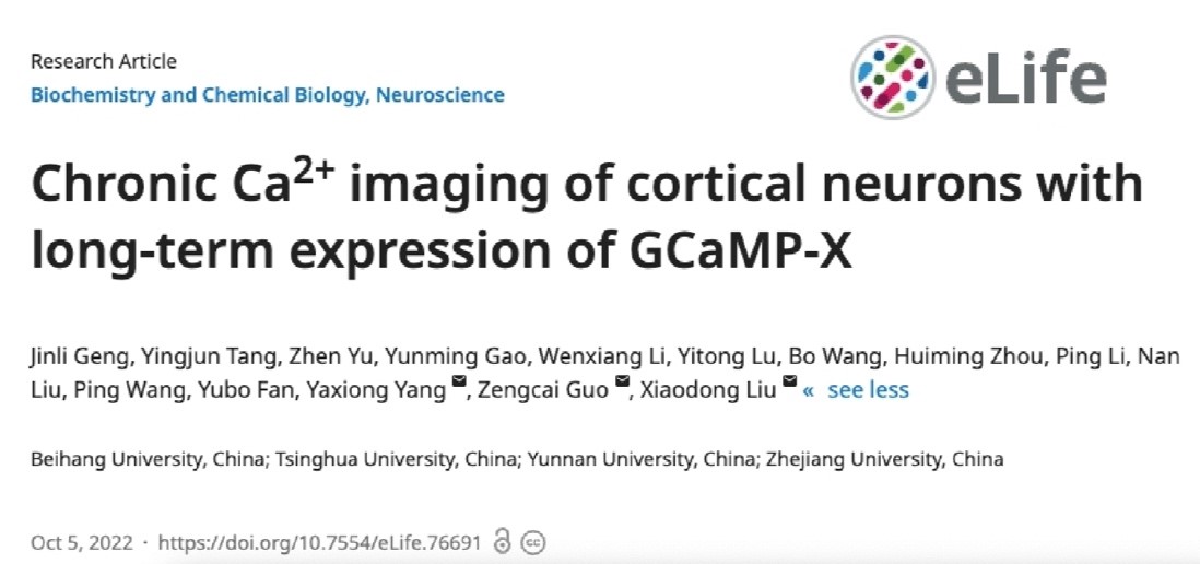 近日,国际学术期刊《eLife》在线发表题为“Chronic Ca2+ imaging of cortical neurons with long-term expression of GCaMP-X”的研究论文。该工作由北京亚洲成人在线一二三四五六区生物医学工程高精尖创新中心刘晓冬教授课题组联合樊瑜波教授团队与合作者共同完成。钙动态的长期监测对于神经科学等领域意义重大,但在实际应用中,由于常用基因编码钙离子荧光探针GCaMP具有细胞毒性而受到多方面的限制。基于刘晓冬课题组此前自主设计开发的改进版钙探针GCaMP-X(Nature Communications 2018, DOI: 10.1038/s41467-018-03719-6),此项工作进一步展示了GCaMP-X优于GCaMP的神经元相容性,实现了离体培养神经元(共聚焦)和活体小鼠大脑皮层(双光子)的长时程GCaMP-X成像,定量揭示了自发钙振荡与神经元形态发育的紧密关联,为神经科学及相关领域的长期钙成像提供了简便而有效的新方案。