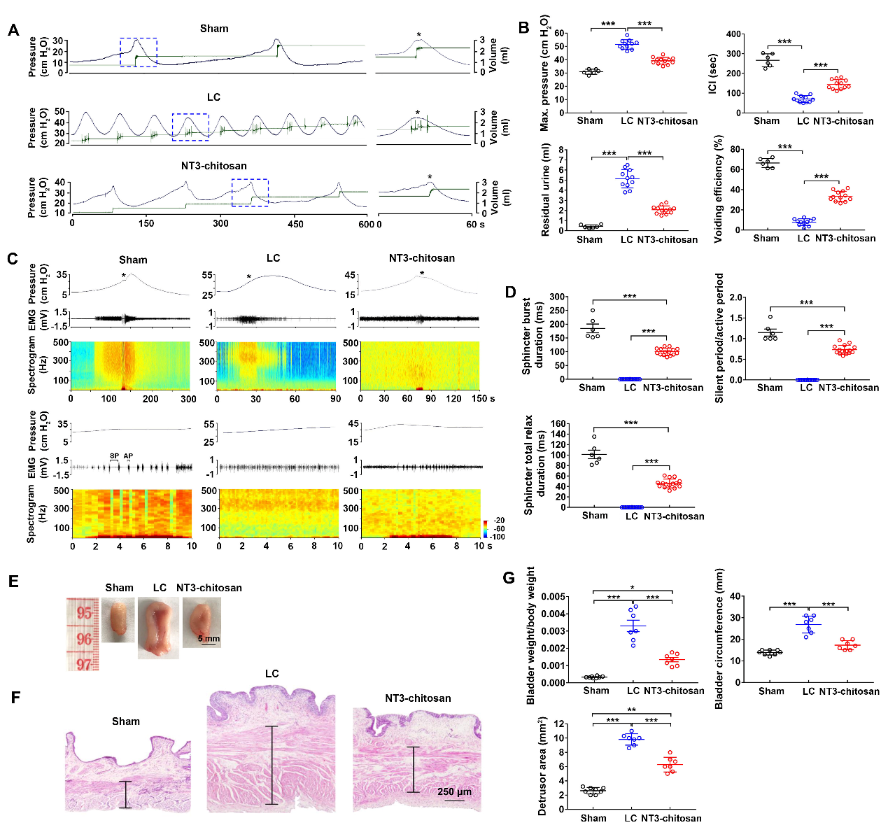 图1. NT3-壳聚糖改善脊髓损伤大鼠神经源性下尿路功能障碍(A-D),减少膀胱组织重塑(E-G)