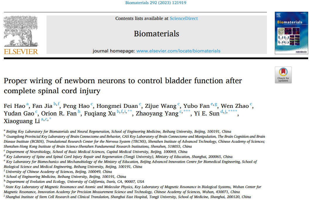 2022年11月29日,国际知名杂志《Biomaterials》报道了北航生物与医学工程学院、北京生物医学高精尖中心李晓光教授团队在脊髓损伤修复后新生神经元的正确连接控制膀胱功能方面取得新进展:《Proper wiring of newborn neurons to control bladder function after complete spinal cord injury》。脊髓损伤修复领域长期致力于如何促进受损的轴突实现长距离轴突再生。李晓光教授团队的前期研究提出了一种新的修复理论:通过诱导内源性神经发生建立新的中继神经环路,桥接受损的头尾两端以恢复受损的神经功能。然而,这些新生的中继神经环路是否可正确整合到受损的长投射神经环路中及其整合机制目前是未知的。李晓光教授团队首次阐明,应用活性生物材料诱导内源性新生神经元产生,并促进其正确整合到受损的长投射排尿神经环路中。即使脑桥Barrington’s 核到腰骶段脊髓的长投射神经轴突没有再生,但新生的中继神经元可正确桥接控制排尿的脑高级中枢和脊髓低级中枢,重建排尿反射神经环路,并有效恢复脊髓损伤后的膀胱功能。该研究不仅首次揭示了新生中继神经环路在脊髓损伤后功能恢复中的重要作用,也为脊髓损伤后神经源性膀胱功能障碍提供一种新的对因治疗策略。