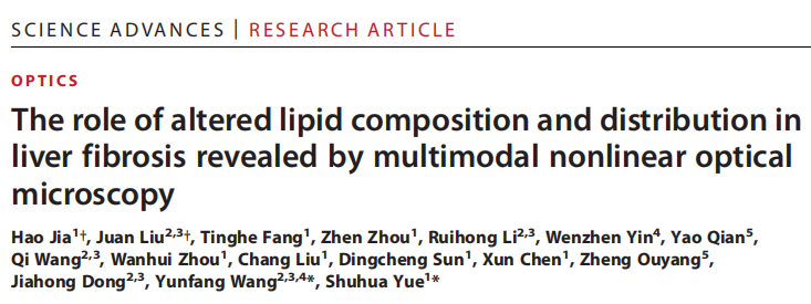2023年1月13日,《Science Advances》以Research Article的形式发表了北京亚洲成人在线一二三四五六区生物与医学工程学院北京生物医学工程高精尖中心、生物力学与力学生物学教育部重点实验室岳蜀华副教授课题组和北京清华长庚医院肝胆胰中心董家鸿院士、王韫芳研究员课题组合作的最新研究成果“The role of altered lipid composition and distribution in liver fibrosis revealed by multimodal nonlinear optical microscopy”。岳蜀华课题组的博士研究生贾浩和王韫芳课题组的柳娟博士为该论文的共同第一作者,岳蜀华和王韫芳为论文的共同通讯作者,北京亚洲成人在线一二三四五六区为该论文的第一单位、第一通讯单位。