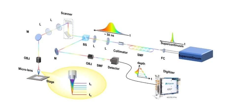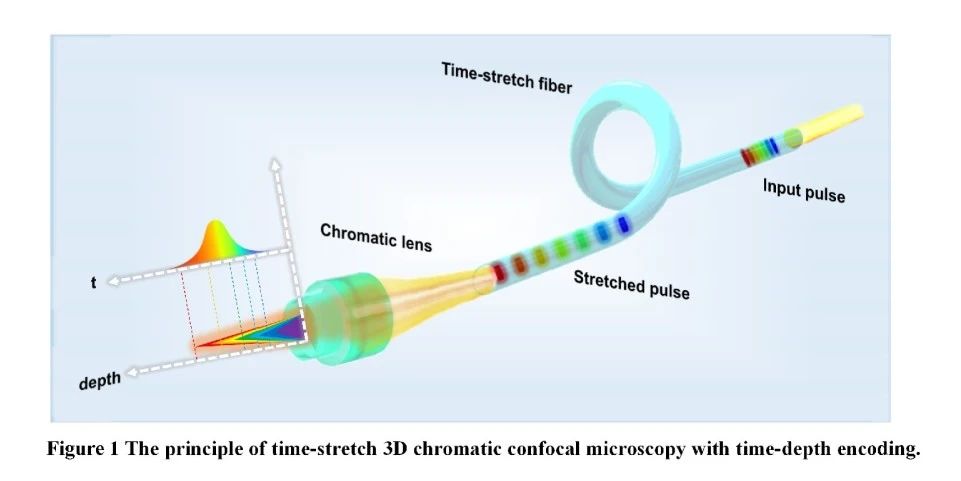 因此,为了提升色散共聚焦显微镜3D成像速度,该研究提出了一种用于多深度同时成像的时间拉伸色散共聚焦显微镜(TSCCM)。该研究摒弃了用波长来编码深度信息并通过光谱仪收集到的光谱来进行解码的方法,创新地提出了用时间来编码深度信息的方法,首次将时间拉伸技术与色散共聚焦技术进行结合。实现了50 ns的时间拉伸,5 Hz的3D成像速度,显著提升了色散共聚焦成像技术的3D成像速度。