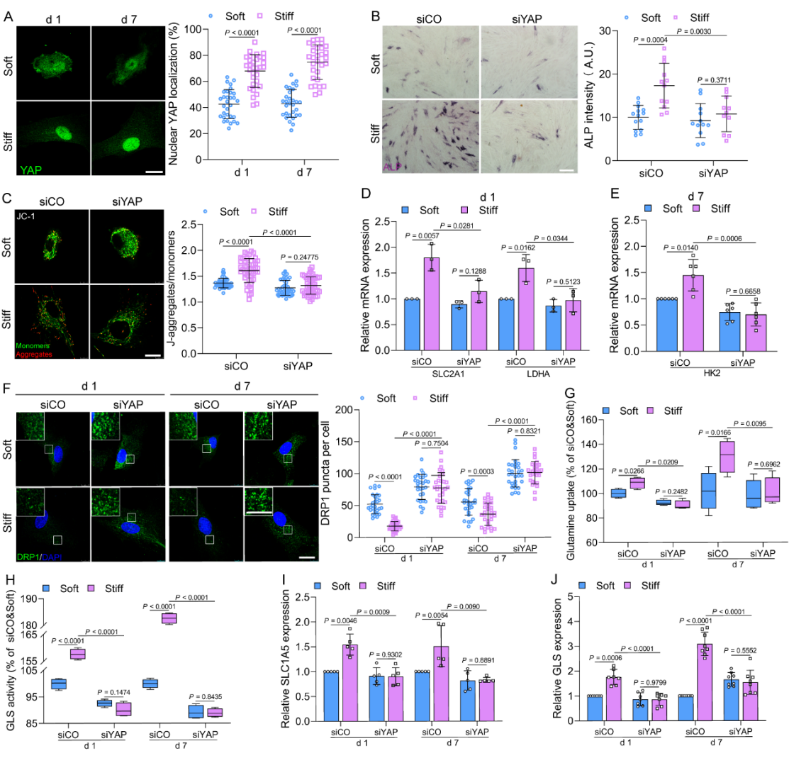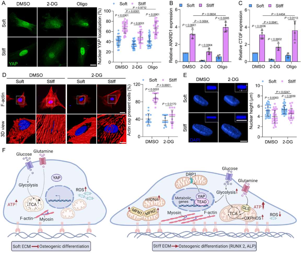 该研究发现,高刚度细胞外基质可增强细胞氧化磷酸化、糖酵解和抗氧化功能,且糖酵解是ATP的主要生成途径(图1)。同时,高刚度细胞外基质通过上调线粒体融合蛋白1和2(MFN1/2)的表达以及抑制线粒体分裂动力相关蛋白1(DRP1)的活性来促进线粒体融合,进而促进成骨(图2)。此外,力学敏感因子YAP可通过影响糖酵解、线粒体动力学和谷氨酰胺代谢调节刚度介导的成骨分化(图3)。而糖酵解反过来可通过细胞骨架张力介导的细胞核形变来调节YAP活性(图4)。